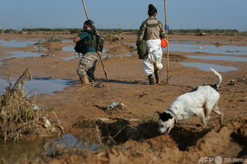 【11月20日 AFP】スペイン東部バレンシア州の大規模な洪水を受け、カタロハ近くのアルブフェーラ国立公園の水田で、棒を使って犠牲者を捜索するボランティア。この洪水は、欧州において過去数十年間で最も深刻な被害をもたらした。特にバレンシア州では、少なくとも220人が死亡、数十人が行方不明となり、町全体が泥に埋まった。(c)AFP