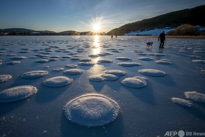 【1月9日 AFP】フランス中東部レルースで、凍結したルース湖の上にできたパンケーキ状の雪の間を歩く人々。この現象は、水中にある固まる前の氷が、波や流れでパンケーキのような円盤状に凝集されてできたもの。(c)AFP