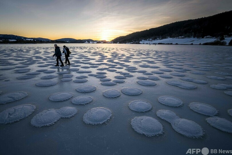 【1月9日 AFP】フランス中東部レルースで、凍結したルース湖の上にできたパンケーキ状の雪の間を歩く人々。この現象は、水中にある固まる前の氷が、波や流れでパンケーキのような円盤状に凝集されてできたもの。(c)AFP