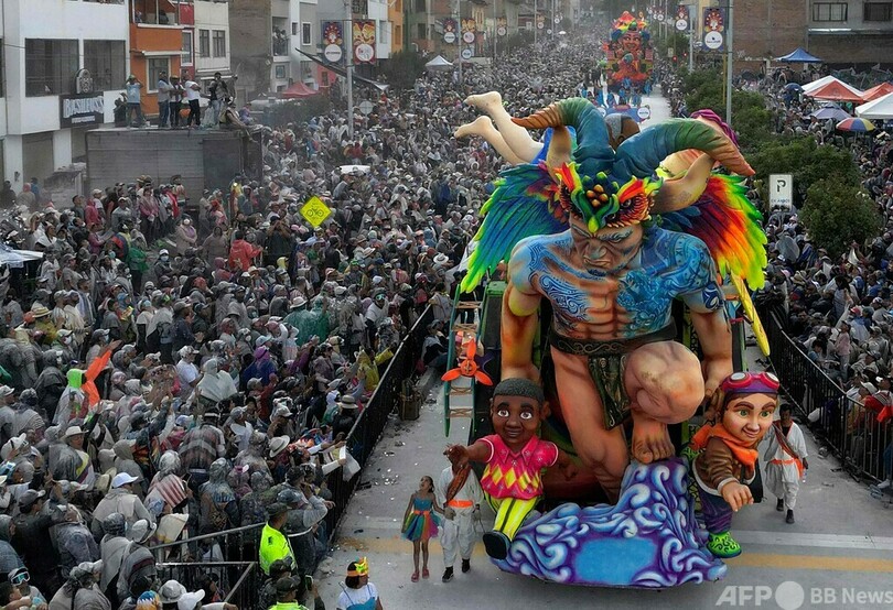 【2025年1月14日 AFP】コロンビア・パストで開かれた「黒と白のカーニバル」のパレードで、伝統的なフロート車を率いるパフォーマー。アンデス、アマゾン、太平洋の文化に起源を持つこの祭りは、地域の民族的多様性をたたえており、2009年に国連教育科学文化機関(ユネスコ)の無形文化遺産に登録された。(c)AFP