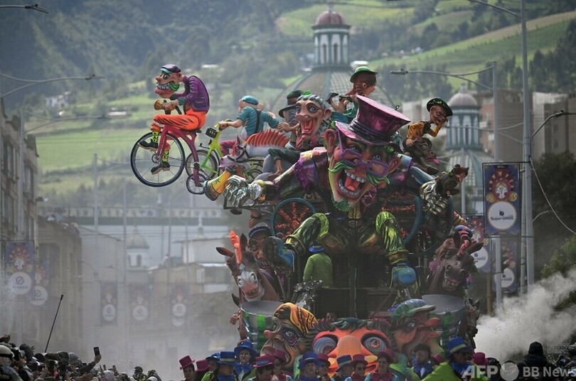 【2025年1月14日 AFP】コロンビア・パストで開かれた「黒と白のカーニバル」のパレードで、伝統的なフロート車を率いるパフォーマー。アンデス、アマゾン、太平洋の文化に起源を持つこの祭りは、地域の民族的多様性をたたえており、2009年に国連教育科学文化機関(ユネスコ)の無形文化遺産に登録された。(c)AFP