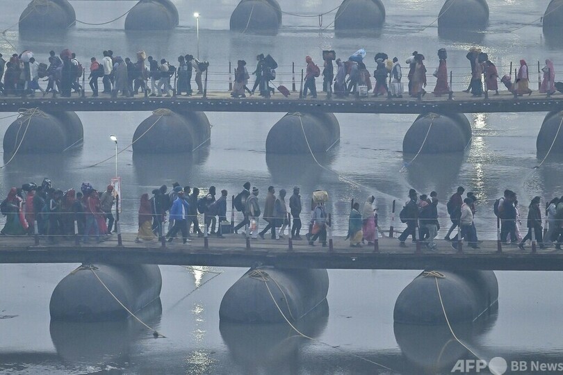 【1月24日 AFP】インド・プラヤグラージでヒンズー教の宗教行事「クンブメーラ」が開かれ、霧深い冬の夕方、ガンジス川、ヤムナ川、そして神話上のサラスバティー川の合流点サンガムに向かい、浮き橋の上を歩く巡礼者。13日に始まったクンブメーラでは大勢の巡礼者が聖なる川で沐浴した。運営者によると、6週間続くこの世界最大の集会に4億人の人出が予想される。(c)AFP