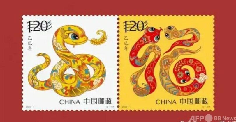 中国発行の巳年干支切手。敦煌壁画と伝統的民俗からインスピレーションを得て、明るい色彩と変化に富んだラインにより活発で無邪気なイメージを作り出しています。(c)CGTN Japanese/AFPBB News