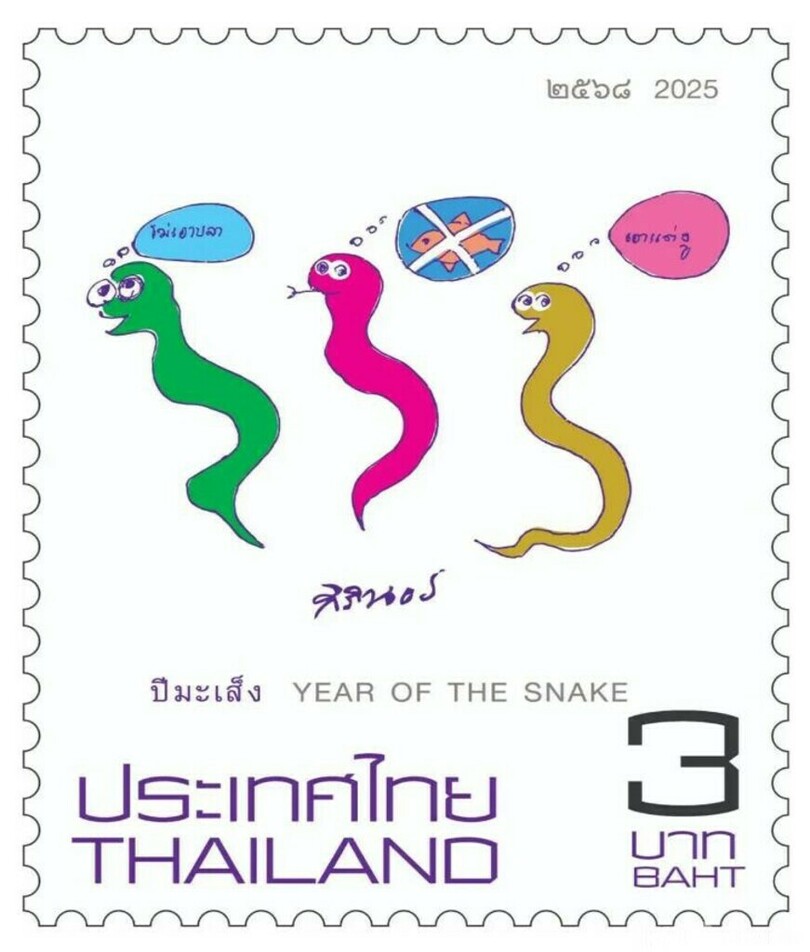 タイ発行の巳年干支切手。中国とタイの友好の使者として親しまれるシリントーン王女が手描きしたもので、自筆署名もあります。