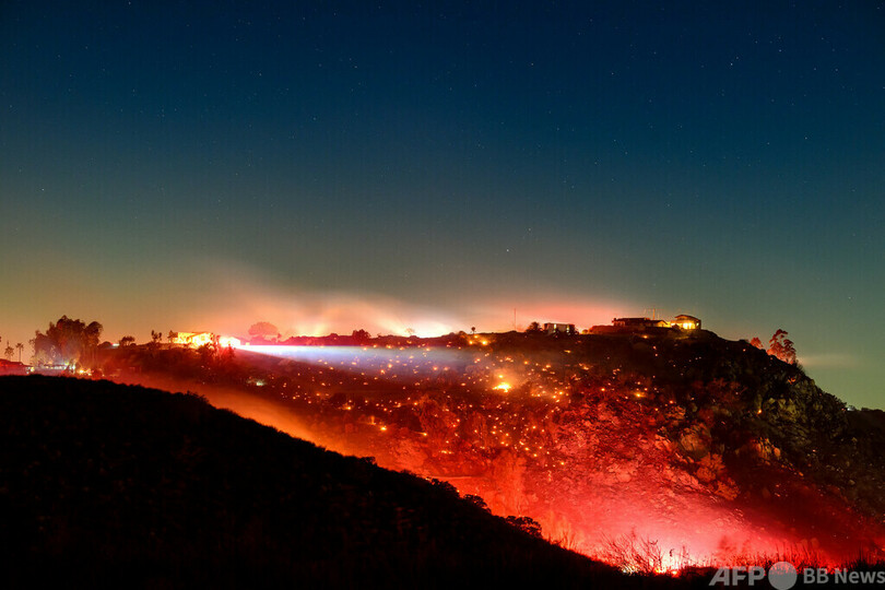 【2月4日 AFP】米カリフォルニア・サンディエゴ郡の未編入地域で起こったライラック火災で、現場を調査するヘリコプターを捉えた長時間露光写真。カリフォルニア州知事が偽情報の流布を非難する中、疲弊した消防隊員は、さらに危険な強風の再来に備えた。当局によると、米国第二の都市で約1万6000ヘクタールを焼き払った2つの大火災の大半は鎮火したという。(c)AFP