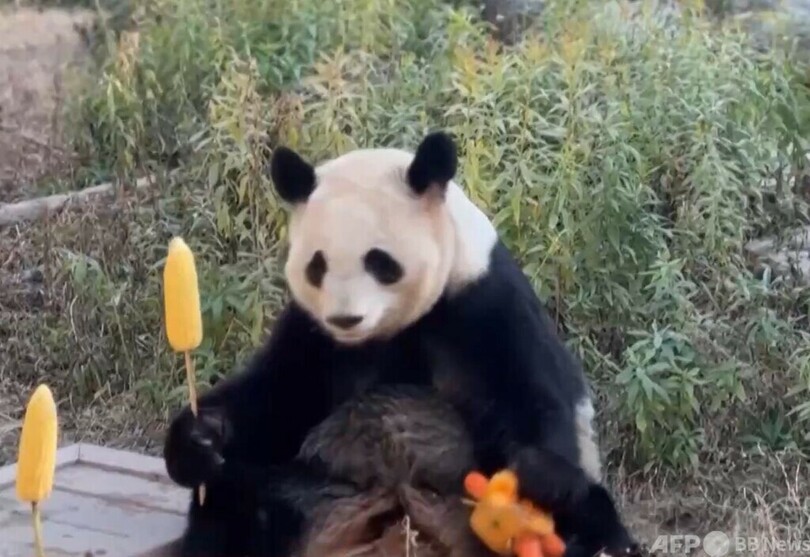 中国北部内蒙古自治区オルドス市のオルドス野生動物園では、ジャイアントパンダの七巧(チーチャオ)と七喜(チーシー)の串刺しのフルーツを入れた特製アイスケーキがお年玉として送られました。(c)CGTN Japanese/AFPBB News