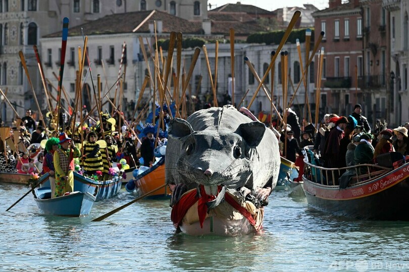 【今日の1枚】水上パレードを行く巨大ネズミ? 伊ベネチア