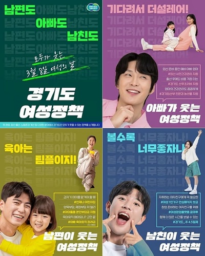 京畿道が公式SNSに掲載したポスターには、満面の笑みを浮かべる男性たちの姿の横に「パパ・夫・彼氏が笑う女性政策」という文言が大きく記されていた。一方で、ポスター上部には女性たちの写真が比較的小さく添えられていた。
