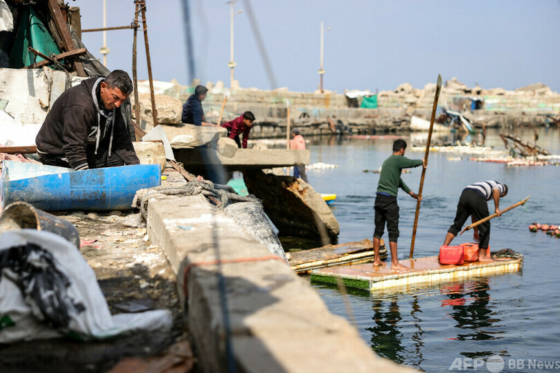 【3月30日 AFP】パレスチナ自治区ガザ市の港で、魚を捕るために冷蔵庫のドアで作ったいかだに乗る男性。イスラエルとイスラム組織ハマスとの15か月以上に及ぶ戦闘で、イスラエル軍の空爆により港のほとんどの舟は失われ、漁師の生業が行き詰まっている。(c)AFP