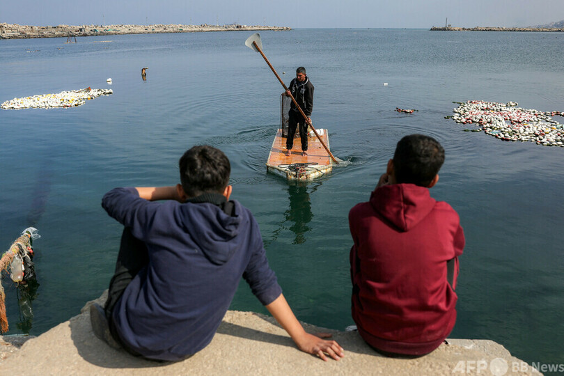【3月30日 AFP】パレスチナ自治区ガザ市の港で、魚を捕るために冷蔵庫のドアで作ったいかだに乗る男性。イスラエルとイスラム組織ハマスとの15か月以上に及ぶ戦闘で、イスラエル軍の空爆により港のほとんどの舟は失われ、漁師の生業が行き詰まっている。(c)AFP