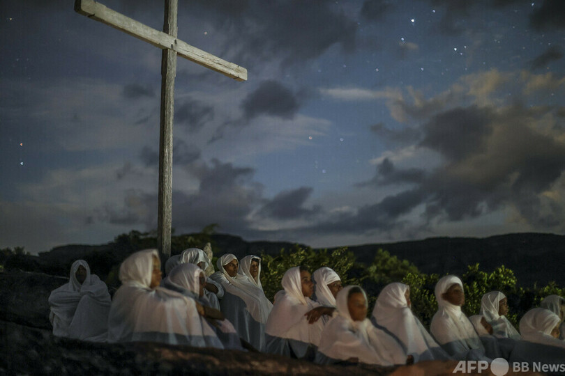 【5月1日 AFP】ブラジル・バイア州シャパーダ・ディアマンティナ国立公園にある孤立した小村落イガトゥで「テルノダスアルマス」の行進が行われ、十字架のそばに集まる白装束のカトリック信者ら。テルノダスアルマスは、聖週間の夜に村落中を巡回し、死者に祈りと歌を捧げる古代儀式だ。(c)AFP