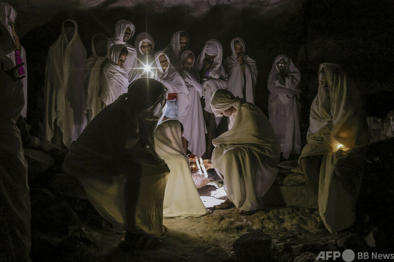 【5月1日 AFP】ブラジル・バイア州シャパーダ・ディアマンティナ国立公園にある孤立した小村落イガトゥで「テルノダスアルマス」の行進が行われ、十字架のそばに集まる白装束のカトリック信者ら。テルノダスアルマスは、聖週間の夜に村落中を巡回し、死者に祈りと歌を捧げる古代儀式だ。(c)AFP