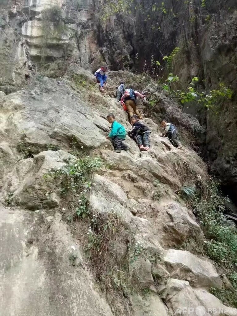 子どもたちが山奥から学校に通うのを助けるため、祖父母の世代は素手で登れる石の足場を削り出し、父親の世代は階段状の桟道(さんどう)を築いた。