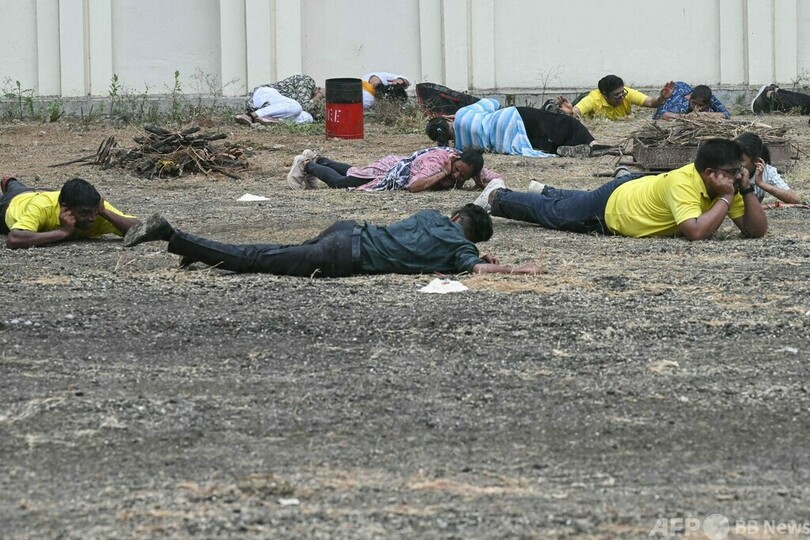 【5月16日 AFP】対パキスタン国境での緊張が高まる中、インド・ニューデリーで、全国民間防衛模擬訓練の一環として緊急シミュレーション訓練に参加する人々。核保有国の同国とパキスタンで、20年ぶりに激しい衝突が起きた。(c)AFP