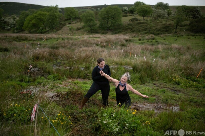 【5月29日 AFP】英イングランド北部ピーク地方の湿原で行われた泥んこ障害物レース「ボグ・コマンダー」の参加者。アッシュボーン近郊で。2014年に始められたこのレースは、6キロのぬかるんだコース中に30以上の人工の障害物が設けられている。(c)AFP