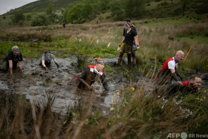 【5月29日 AFP】英イングランド北部ピーク地方の湿原で行われた泥んこ障害物レース「ボグ・コマンダー」の参加者。アッシュボーン近郊で。2014年に始められたこのレースは、6キロのぬかるんだコース中に30以上の人工の障害物が設けられている。(c)AFP