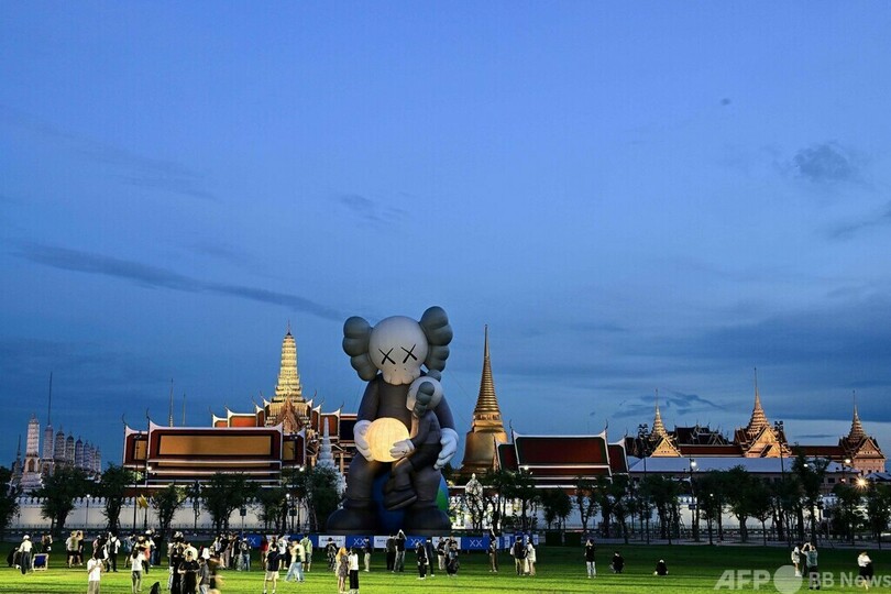 【5月31日 AFP】タイ・バンコクの王宮(グランドパレス)前のサナーム・ルアン広場に設置された、フィギュア「コンパニオン(COMPANION)」を含むアートインスタレーション「カウズ:ホリデー(KAWS:HOLIDAY)」を見る人々。この作品は、カウズ(Kaws)の名で知られるアーティスト、ブライアン・ドネリーさんが制作した。(c)AFP