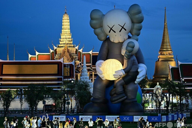 【5月31日 AFP】タイ・バンコクの王宮(グランドパレス)前のサナーム・ルアン広場に設置された、フィギュア「コンパニオン(COMPANION)」を含むアートインスタレーション「カウズ:ホリデー(KAWS:HOLIDAY)」を見る人々。この作品は、カウズ(Kaws)の名で知られるアーティスト、ブライアン・ドネリーさんが制作した。(c)AFP