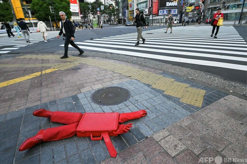 【6月2日 AFP】フランス人ストリートアーティストのジェームズ・コロミナ氏による「ブリーフケース」というタイトルのアートインスタレーション。東京・渋谷の交差点で。腕や足、ネクタイが突き出た赤いブリーフケースは、「サラリーマン」をテーマに、仕事と服従を表すアイテムとして用いられている。(c)AFP