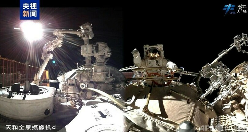 中国の宇宙ステーションが応用・発展段階に入って以来、宇宙飛行士が天和コアモジュールのノードモジュールを通じて船外に出たのは、今回が初めてです。宇宙飛行士の船外活動と貨物の船外搬送が連携して実施されたのも初めてです。(c)CGTN Japanese/AFPBB News