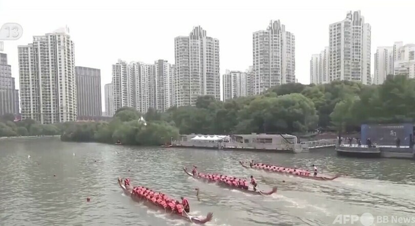 今年のドラゴンボート招待レースには計58チームが参加し、五つのグループに分かれて激しい熱戦を繰り広げました。上海で働く外国人や留学生の人々も、多くのチームで主力を務めました。オランダ、ベルギー、ルクセンブルクを表す中国語のそれぞれの頭文字をとった「荷比盧」チームの12人のメンバーはいずれも上海の外資系企業でインターンシップを経験しています。この12人は中国で初めてドラゴンボートをこぎ、中国の端午節の文化を体験しました。(c)CGTN Japanese/AFPBB News