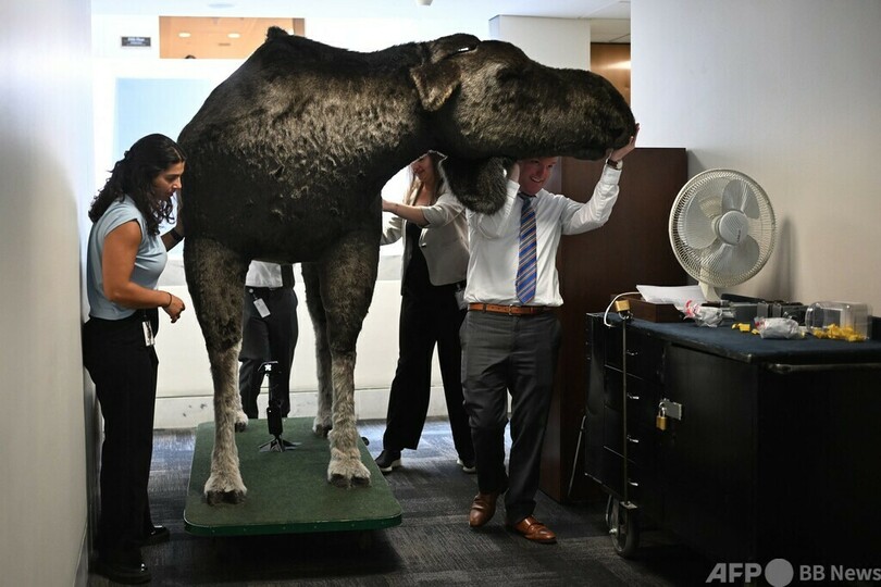 【6月25日 AFP】米ワシントンで、ハート議員会館にあるジーン・シャヒーン上院議員の事務所へ議会スタッフらの手によって運ばれるヘラジカの「マーティ」。毎年恒例の「ニューハンプシャー体験会」で、マーティはホワイト山脈のアンバサダーを務めている。(c)AFP