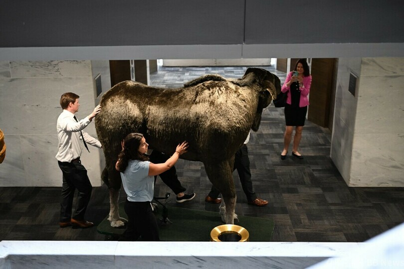 【6月25日 AFP】米ワシントンで、ハート議員会館にあるジーン・シャヒーン上院議員の事務所へ議会スタッフらの手によって運ばれるヘラジカの「マーティ」。毎年恒例の「ニューハンプシャー体験会」で、マーティはホワイト山脈のアンバサダーを務めている。(c)AFP