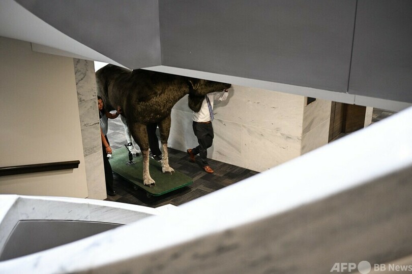 【6月25日 AFP】米ワシントンで、ハート議員会館にあるジーン・シャヒーン上院議員の事務所へ議会スタッフらの手によって運ばれるヘラジカの「マーティ」。毎年恒例の「ニューハンプシャー体験会」で、マーティはホワイト山脈のアンバサダーを務めている。(c)AFP