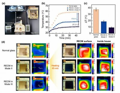 研究チームは「単一の素子内で光と熱の透過率を、モードごとに異なるよう調整できるため、季節や時間帯、使用者の目的に応じて柔軟に対応できる」と見通している。また「ミニチュアハウスにRECMシステムを適用した実験では、一般的なガラスを使用した場合に比べて最大27.2℃の温度低減効果が確認された」と述べた。