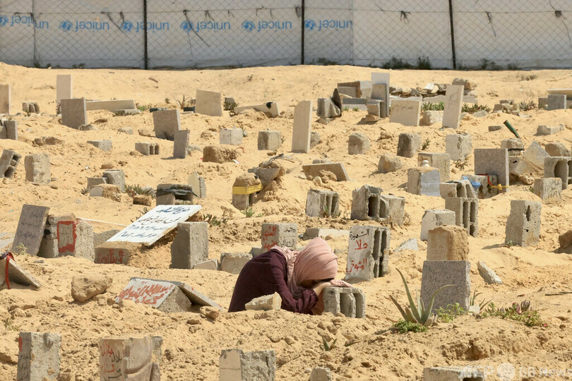 【7月1日 AFP】パレスチナ自治区ガザ地区南部のハンユニスで、親族の墓のそばで嘆き悲しむ女性。ガザ地区の民間防衛当局によると、6月16日だけで、南部で救援物資を待っていた20人がイスラエル軍に殺害されたという。(c)AFP