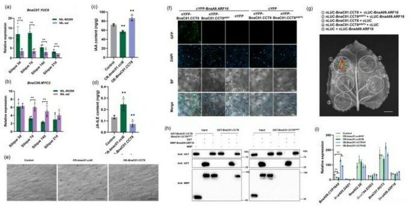 アブラナは中国最大の油料作物であり、油の年間生産量は国内油料作物による油生産量の50%以上を占め、その生産量の向上は国の食用油の安全問題に直接関わっています。このため、王漢中院士チームは化学誘起変化とマップベースクローニング技術を通じて、5年間の系統的な研究を経て、アブラナの生産量を制御する重要な遺伝子BnaC01.CCT8を同定することに成功しました。この遺伝子は、同チームが先に発見したアブラナの生産量を左右する遺伝子BnARF18とタンパク複合体を形成することにより、独特な生長ホルモンの合成促進とジャスミン酸合成抑制の制御ネットワークを構築し、角果(かくか)の伸長と種子の発育を促進します。