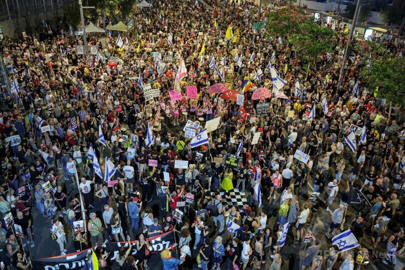 テルアビブ中心部の「人質の広場」に集まったデモ隊は、イスラエル国旗や、2023年10月7日のイスラム組織ハマスによる越境攻撃で拘束された人質の写真を掲げ、解放を訴えた。