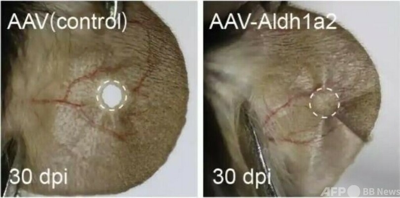 共同研究チームはAldh1a2遺伝子の直接活性化や外因性レチノイン酸の補充を試み、いずれも本来再生能力を備えていない成体マウスの耳介の傷に耳介の軟骨と神経組織を再建し、再生できることを発見しました。(c)CGTN Japanese/AFPBB News
