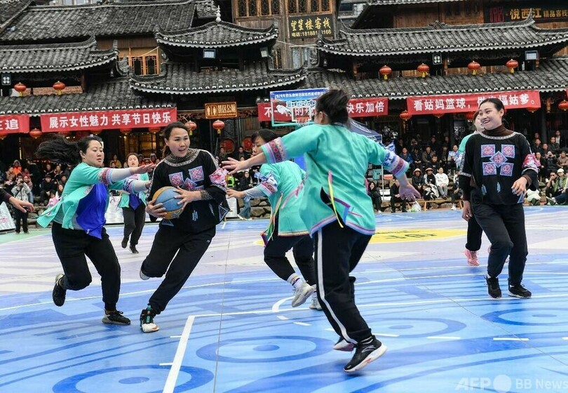 この活気あふれるバスケ大会は、ミャオ族の千年の伝統の韻律と時代の鼓動とが交じり合った特別な場所となっている。(c)PeopleʼsDaily/AFPBBNews