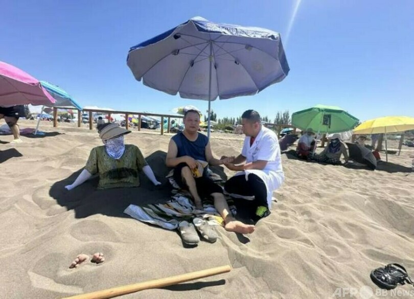 トルファンの砂療法は、現地ならではの太陽光資源を活用し、患部を砂に埋めることで太陽熱・圧力・磁力の複合作用を発生させ、関節リウマチや頸椎症の痛みを緩和します。治療のベストシーズンは6~9月です。(c)CGTN Japanese/AFPBB News