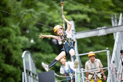 新潟県妙高市の「ロッテアライリゾート」。滑車にぶら下がってワイヤを滑り降りるジップライン、夏の高原でのツリーアドベンチャー、秋の山で紅葉ハイクと温泉、冬はスキー。全257室の客室は長期滞在に適している。温泉・スパ・プール・多彩なダイニングも楽しめる。