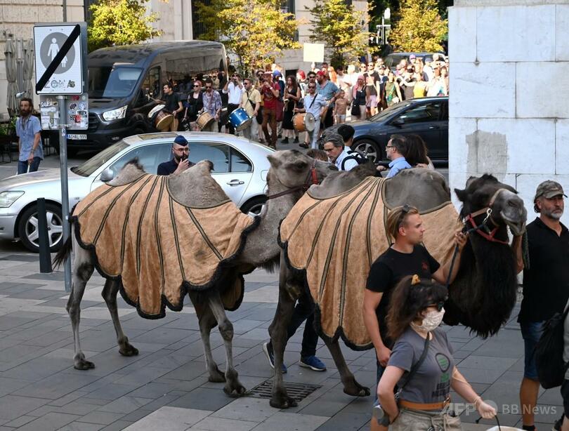ラクダに率いられたデモ隊が抗議 干ばつの危機訴える ハンガリー