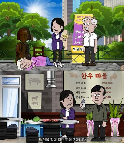 作中で「ユン・グィヒャン」は慰安婦ハルモニ(おばあさん)からの支援金を集めながら、空腹を訴えるハルモニを無視し、亡くなると「これでもう金儲けができない」と嘆く。さらに葬儀場では香典を懐に入れ、肉を買って食べるシーンも描かれる。これは実際のユン・ミヒャン氏が故キム・ボクドンさんの弔慰金を不法に流用したとされる疑惑を風刺したものだ。