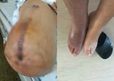「労災特例を受けて治療をしている途中、状態が悪すぎて切断が必要だと言われた。最初は足だけでなく臀部の片側まで全部切除しなければならないと言われた。手術後、最初は足があるように感じたが、触ってみると足はなく、導尿管をつけていた」