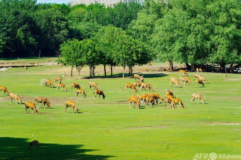 1985年に22頭のシフゾウが英国から北京南海子郊野公園に戻されてから40年にわたる繁殖と野生復帰を経て、中国のシフゾウの数は1万4000頭に達し、生息地も当初の2カ所から94カ所に拡大したとのことです。(c)CGTN Japanese/AFPBB News