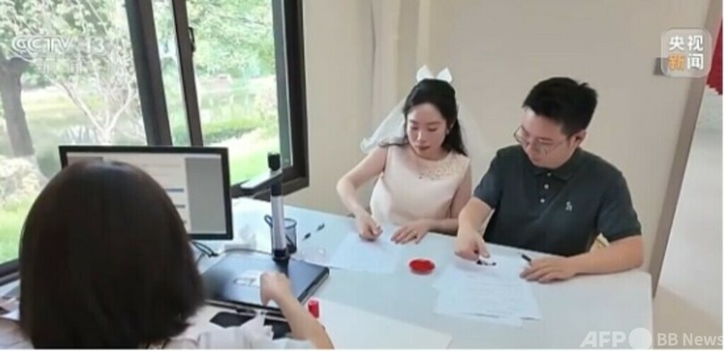 江蘇省南京市では、玄武湖公園内にある婚姻登録所が「ロマンチックな記念スポット」になり、七夕当日には300組以上の予約が入りました。南京市玄武区民政局婚姻登録所の職員によると、予約したカップルの一部には、朝に玄武門で記念撮影を行った後、婚姻登録所まで歩き、「喜扇」と呼ばれるめでたさを表現する団扇に二人で絵を描き、婚姻証書を作成するサービスを提供しました。また、無料で遊覧船に乗って玄武湖の美しい風景を楽しみ、ロマンチックな七夕の思い出を残してもらう取り組みも導入しました。(c)CGTN Japanese/AFPBB News