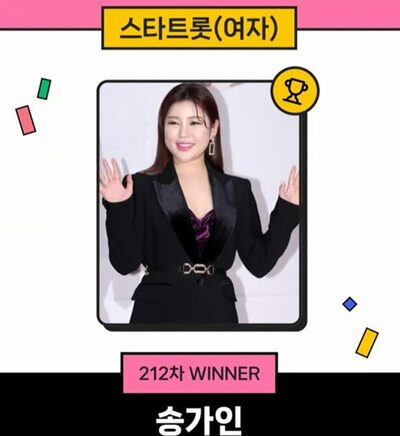 ソン・ガインは、8月28日~9月4日に実施された第212回スターランキング女性トロット部門で7万7544票を獲得。これで212週連続で首位を維持した。
