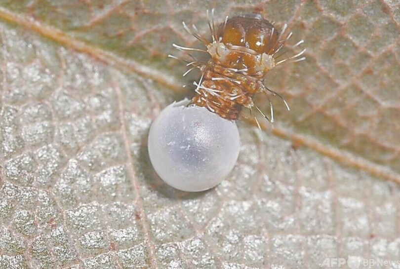 李氏によると、交尾後メスのチョウは通常、20~30メートルの宿主植物の葉に産卵します。このため、研究スタッフははしご車を設置して観測し、はしご車が届かない場合はハーネスを付け、木によじ登って観測しました。8月下旬以来、研究チームは32個の卵粒を発見しました。しかしその大部分は天敵の寄生バチに食い荒らされ、最終的に研究チームは9個の卵粒の完全なふ化過程を記録したとのことです。(c)CGTN Japanese/AFPBB News