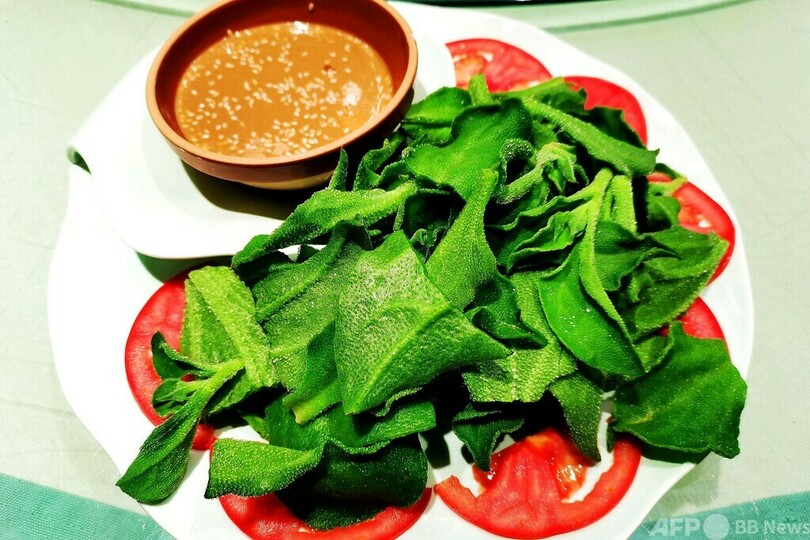 氷菜には「氷草」「水晶氷菜」の別名もあります。原産地のアフリカ南部から導入されて、中国でも栽培されるようになりました。葉と茎に水晶のように見える透明の細胞があることが大きな特徴で、口にすると爽やかな食感で、わずかな天然の塩分を感じます。この野菜にはアミノ酸、天然植物塩、ミネラルが含まれているため、高血圧、糖尿病、高脂血症の人によいとされています。低カロリーかつ低炭水化物の食材でもあります。(c)CGTN Japanese/AFPBB News
