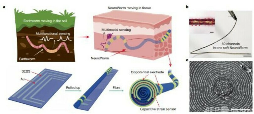 研究チームは、ミミズが土壌の中で柔軟に運動し、体節ごとに感知する能力があることにヒントを得て、精巧な電極構造設計と巻き取り技術により、超薄型フレキシブルポリマー上に作成した二次元電極アレイを直径わずか200マイクロメートルの繊維に巻き付けました。この細い神経繊維電極には、軸方向に最大60個の独立した生体電気信号収集チャンネルが集積されています。