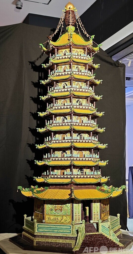大報恩寺瑠璃塔の木製模型は高さ約2メートルで、清代嘉慶年間(1796~1821年)に作られた「江南報恩寺瑠璃宝塔全図」という版画を参照して制作されたもので、1856年に原塔が破壊された後に初めて復元されたものです。(c)CGTN Japanese/AFPBB News