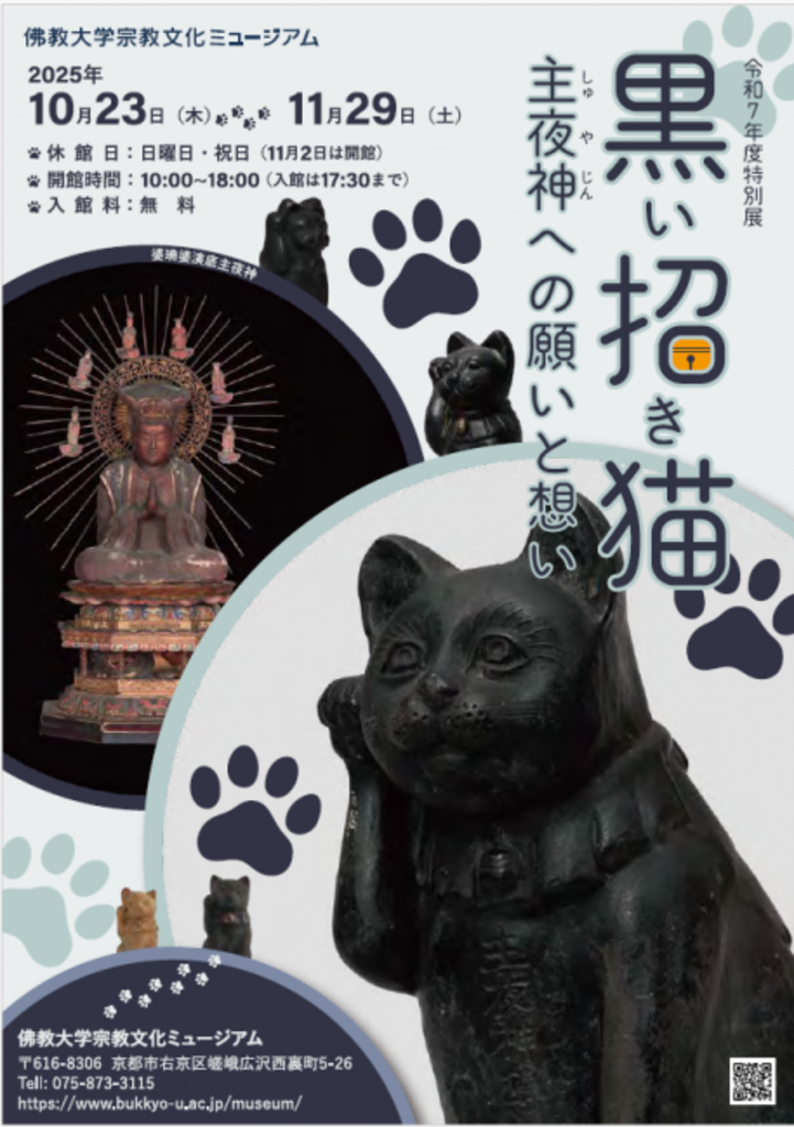 佛教大学宗教文化ミュージアム(京都市右京区)は、黒い招き猫に着目し、2025年10月23日(木)から11月29日(土)まで、特別展「黒い招き猫 主夜神への願いと想い」を開催いたします。本展では、檀王法林寺(京都市東山区)で授与され、人びとに親しまれてきた黒い招き猫と、その背景にある夜を守護する神「主夜神(しゅやじん)」の信仰に焦点をあて、人びとの祈りや託された願いに迫ります。会期中には檀王法林寺住職や専門家を招いたシンポジウムや学芸員によるギャラリートークも行い、多角的にテーマを掘り下げます。