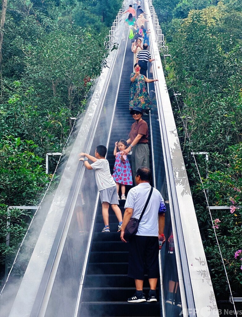 山登りにもこの「ゆるスタイル」が登場している。浙江省の千島湖畔にある天屿山では、徒歩で登れば1時間かかるところを、全長345メートルの屋外エスカレーターでわずか10分。しかも噴霧装置つきで、炎天下でもミストに包まれて涼しく、まるで雲の中を歩いているような気分になれる。