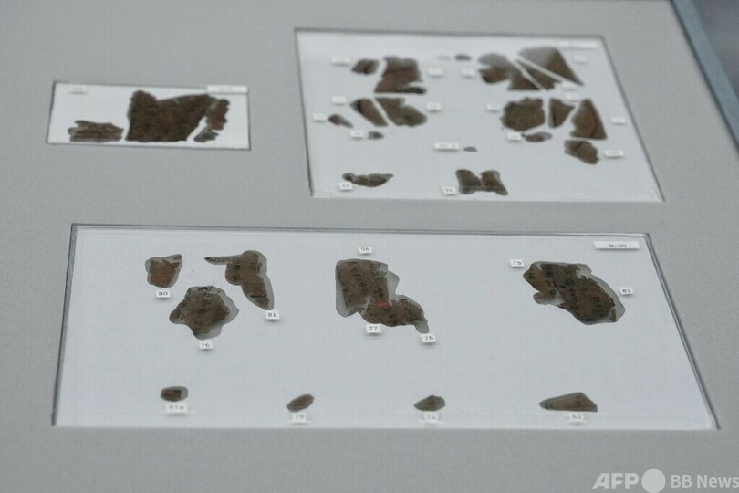 これまで湖南省博物館に収蔵されていた子弾庫戦国帛書の断片は、長さが4.6センチ、幅が2.7センチで、墨で書かれた17文字が残存しており、うち14文字は判読が可能です。子弾庫戦国帛書第2巻と第3巻が回収される前には、この断片が子弾庫戦国帛書が中国国内に残された唯一の断片でした。研究者はこの断片と今回収蔵された子弾庫戦国帛書を照合し、すでに収蔵されていた断片も子弾庫戦国帛書第2巻の『五行令』に属するものと認定しました。(c)CGTN Japanese/AFPBB News