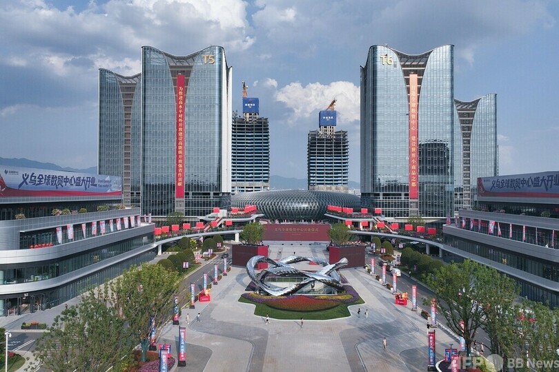 義烏市場のグローバルデジタルトレードセンター建設プロジェクトは2022年に始動しました。施設の建築面積は125万平方メートルで、「新たな商取引」「新たな市場」「新しいランドマーク」という3つの主軸に沿って、「人」「物」「場所」「流通」の4つの核心要素の飛躍的向上を全面推進するものです。施設には市場、ビジネスオフィスビル、商業施設、住居、デジタル取引所ポートの5つの機能エリアが配置されました。うち市場エリアの敷地面積は41万平方メートルで、ファッションと宝飾類、創作玩具、スマート機器など8つの新業種の店舗がすでに入居しました。オリジナルブランドまたはIP(知的財産権)関連品を扱う店舗の割合は57%に達し、場外から新たに参入した業者の割合は約60%に達しています。今後はデジタル化、国際化、近代化、低炭素化といった新たな目標の実現が見込まれています。(c)CGTN Japanese/AFPBB News
